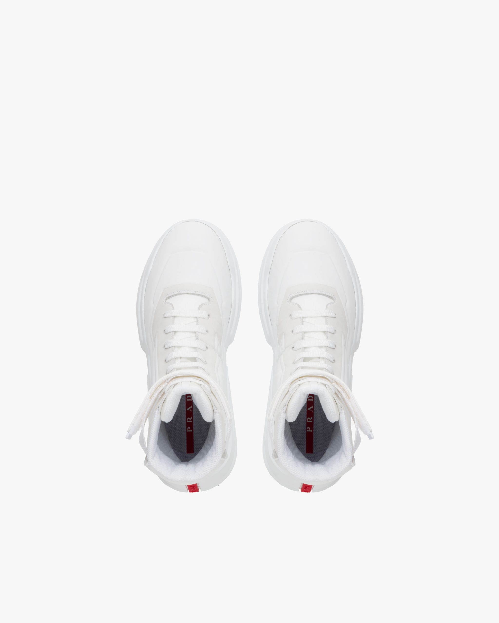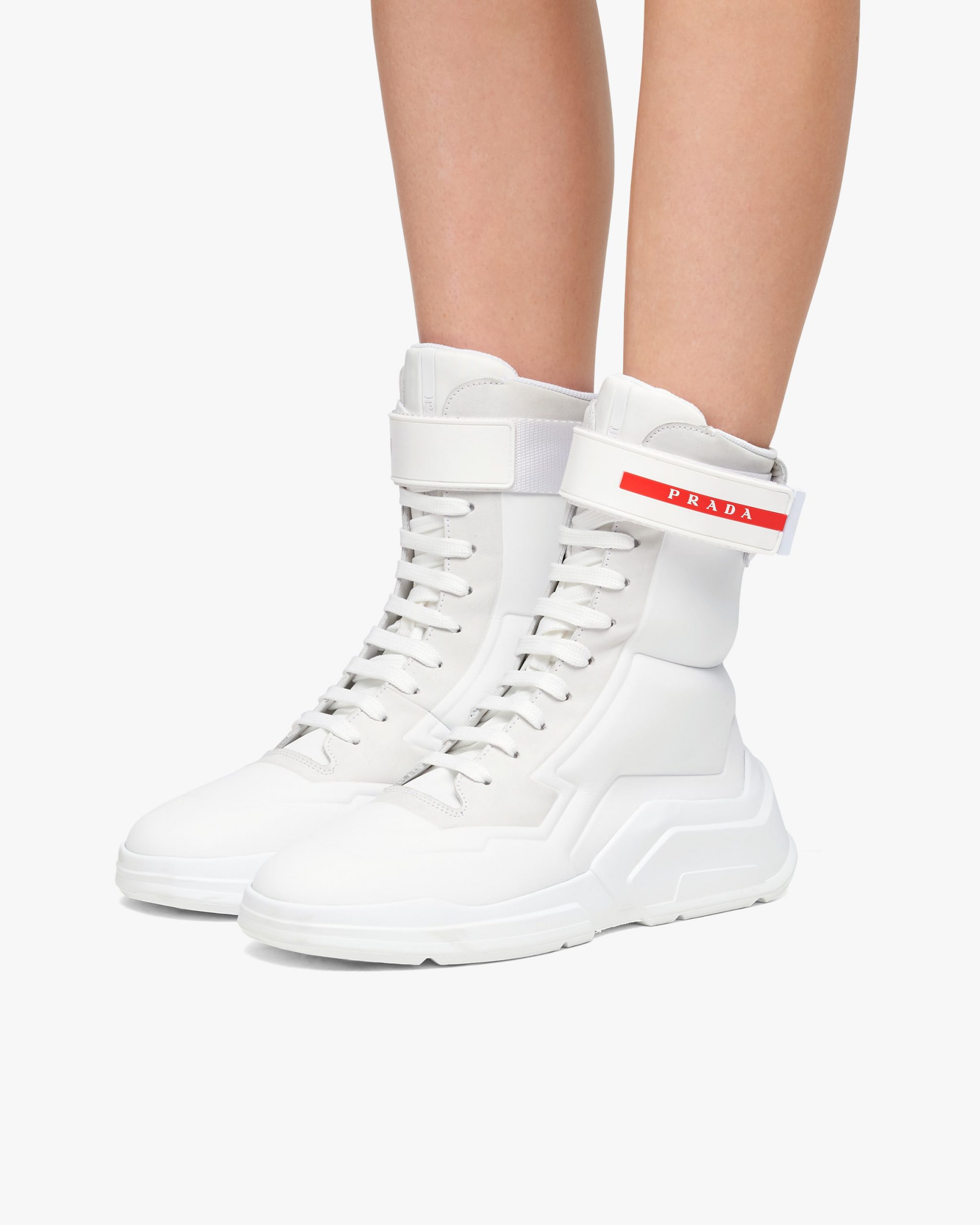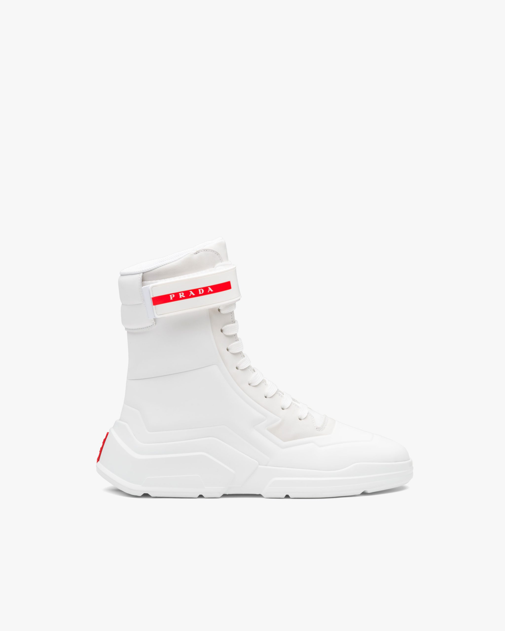 These leather high-top sneakers characterized by the hook and loop fastener strap with Prada Linea Rossa logo2 have a futuristic design.