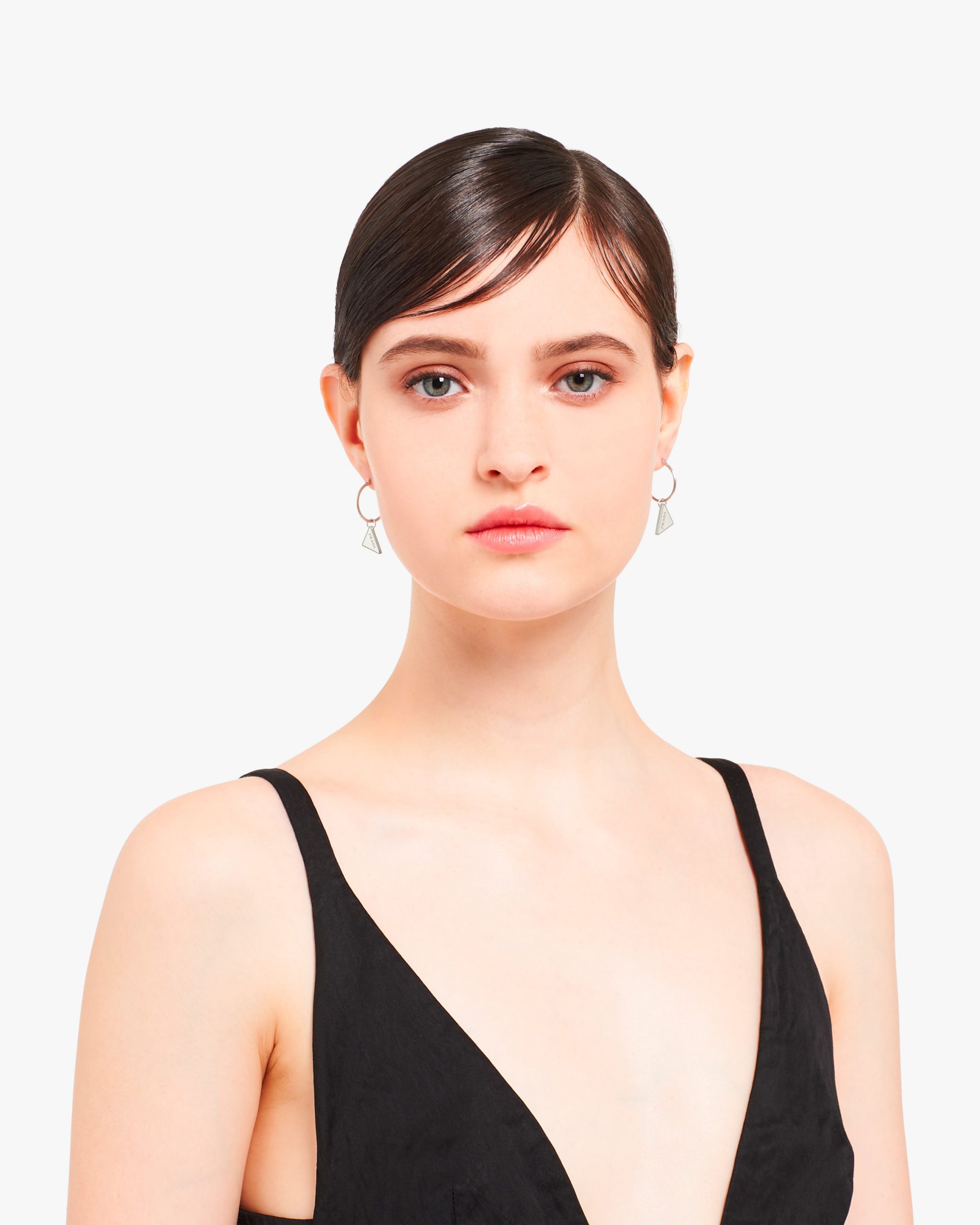 The Prada enamel triangle logo2 returns as a delicate detail on these delicate enameled drop earrings. Iconic and sleek in form, the triangle logo2 is the protagonist of a new line of jewels made of 925 sterling silver, which reinterprets punk influences in a modern way.