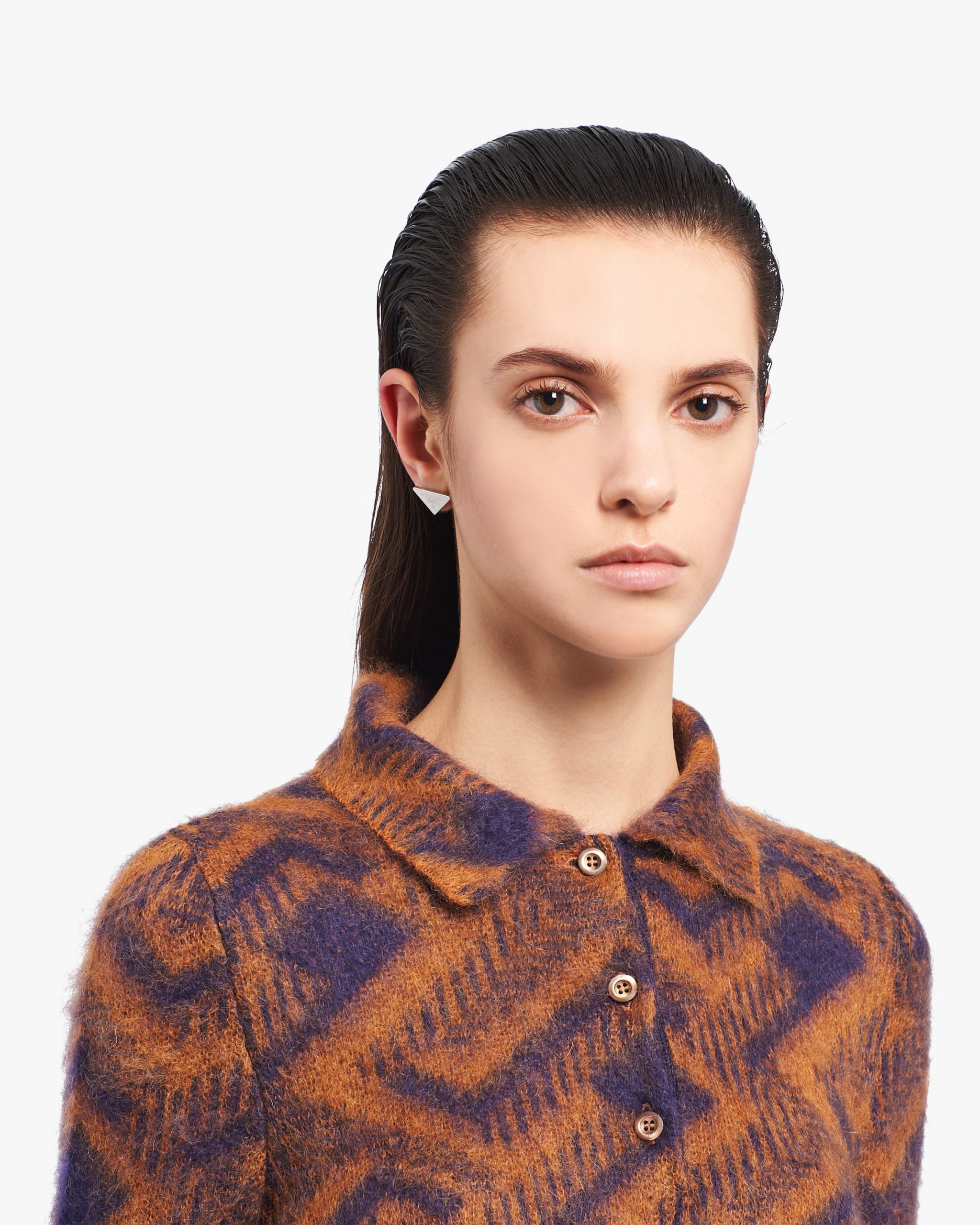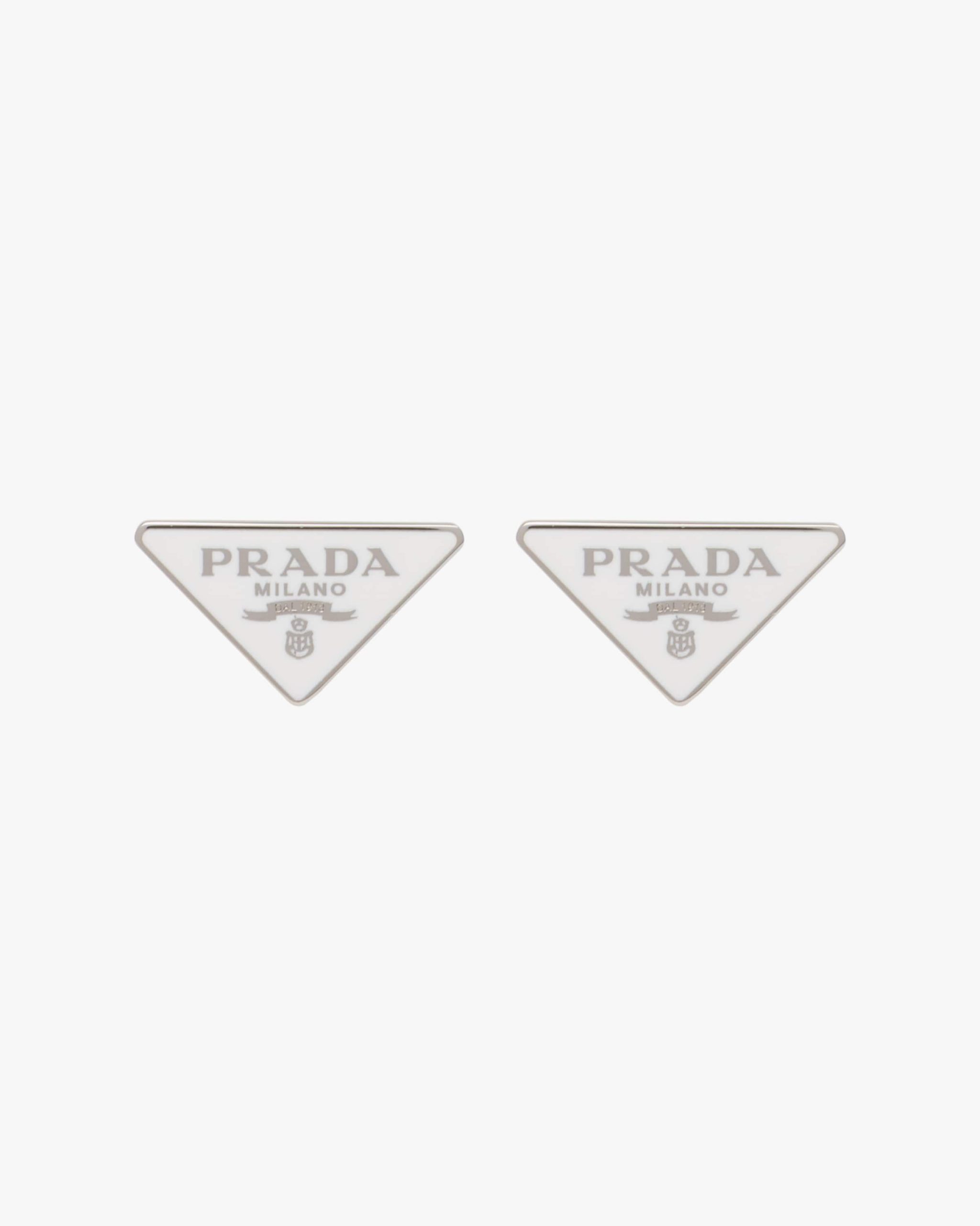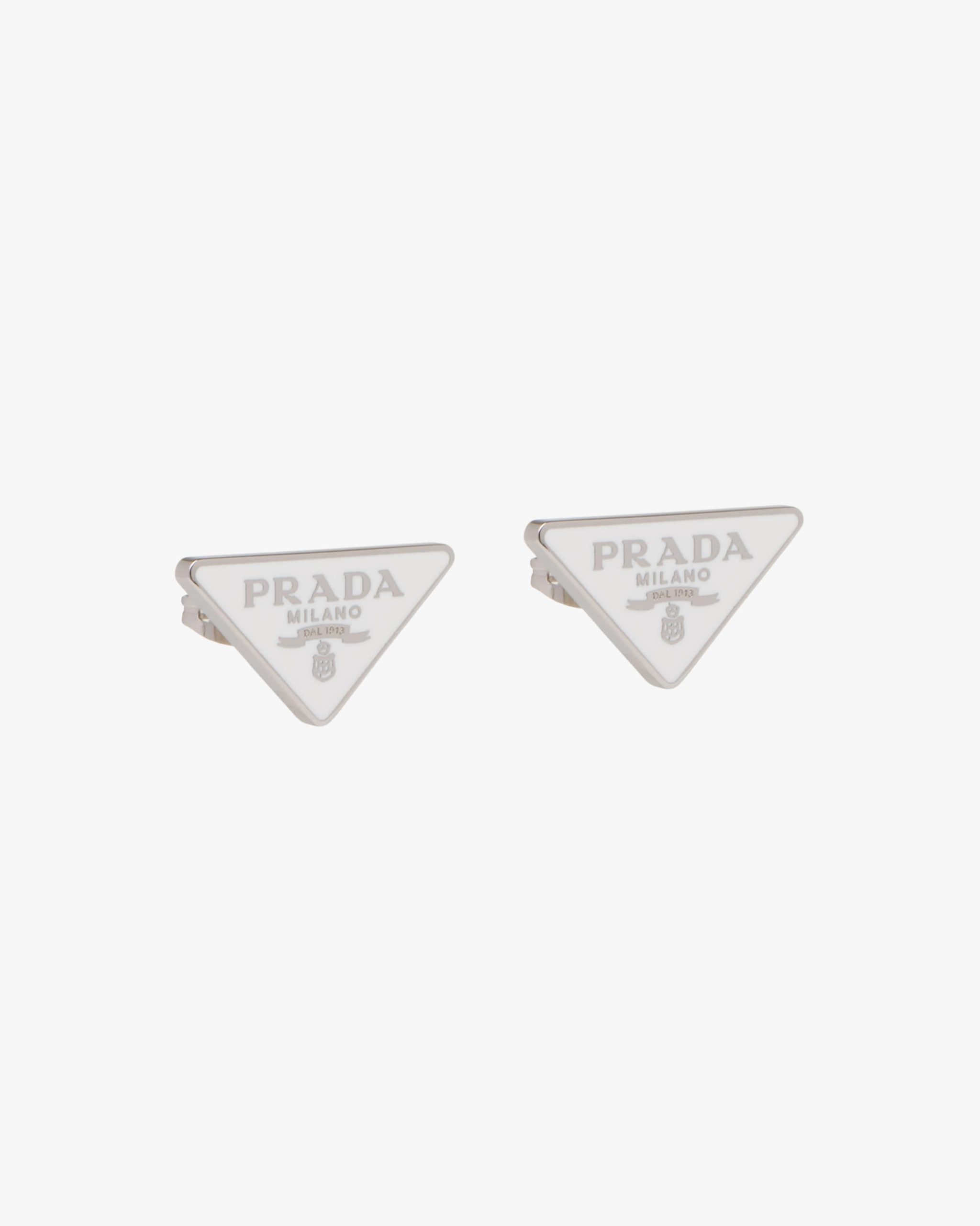 Prada’s historic symbol decorated with enamel defines this pair of earrings. Iconic and sleek, the triangle logo2 is the protagonist of a new line of jewelry made of 925 sterling silver that reinterprets punk influences in a modern way.