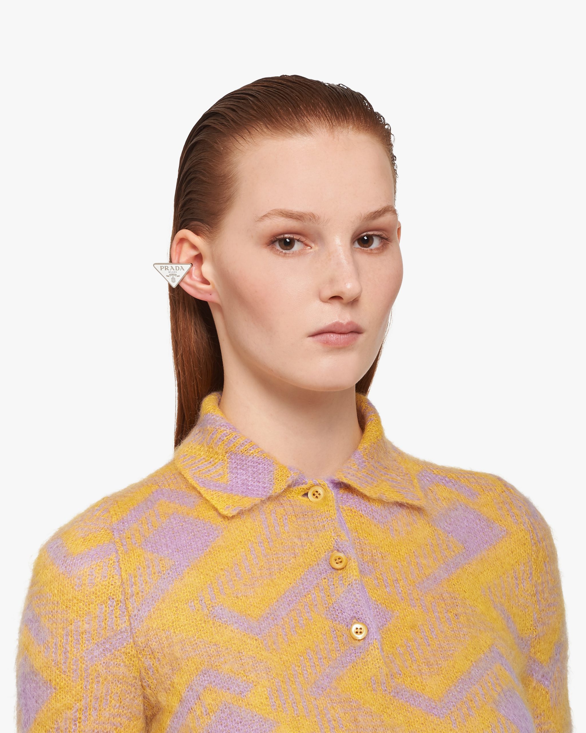Prada’s historic symbol decorated with enamel defines this single earring worn on the right. Iconic and sleek, the triangle logo2 is the protagonist of a new line of jewelry made of 925 sterling silver that reinterprets punk influences in a modern way.