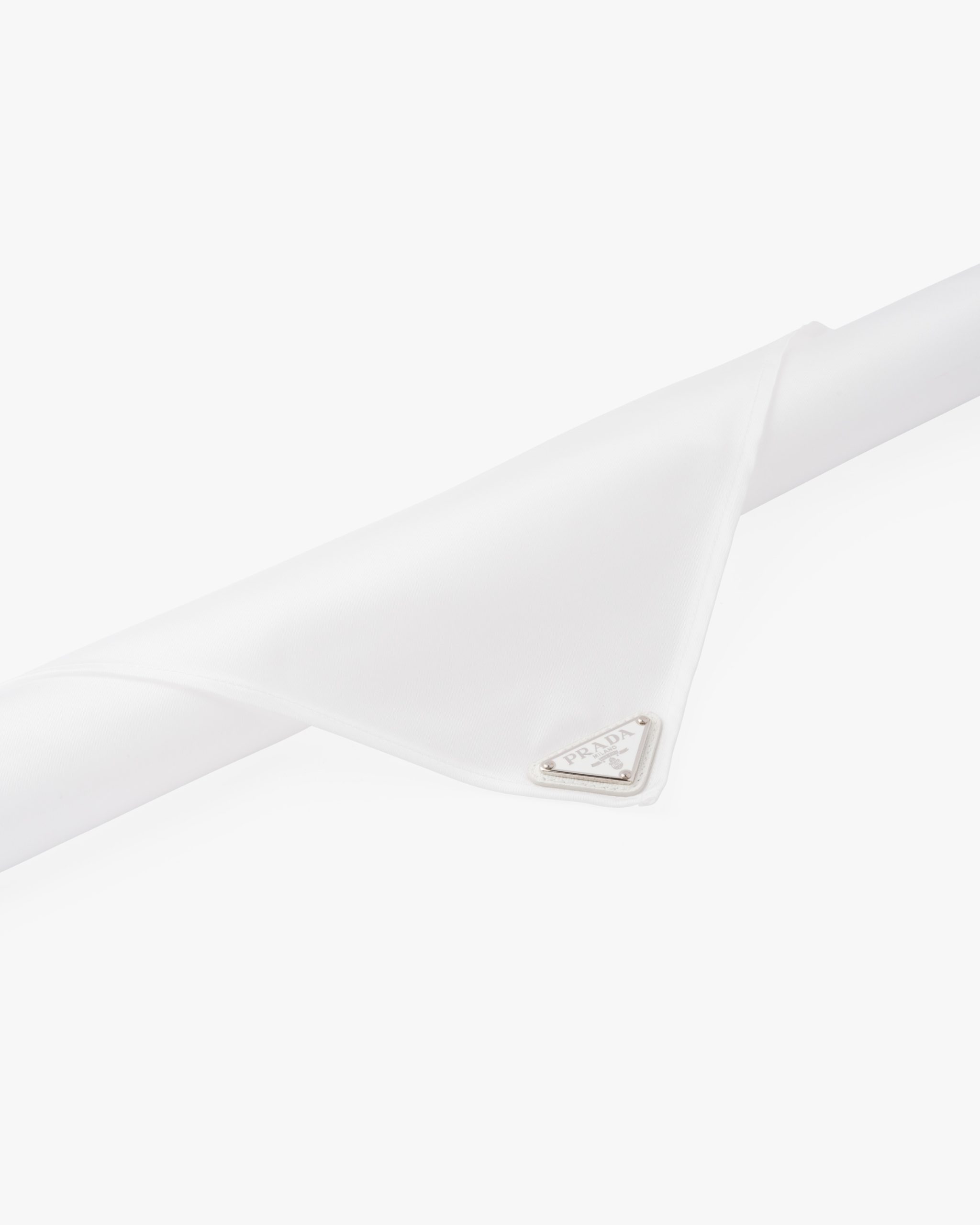 Re-Nylon, a technologically innovative fabric produced from recycled, purified plastic collectsed in the ocean, adds a contemporary note to a classic accessory like this foulard decorated with Prada’s emblematic triangle logo2.