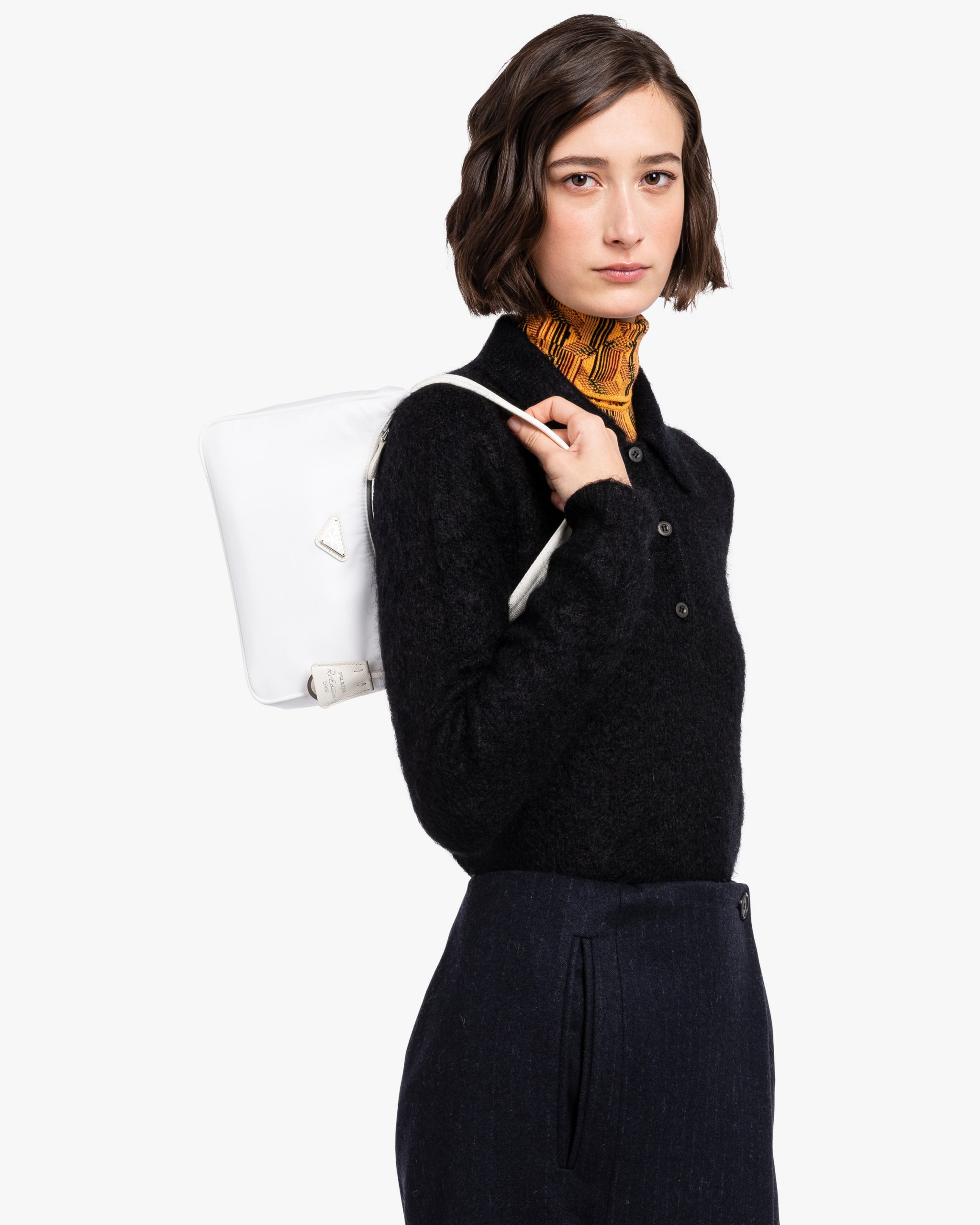 A new interpretation of an iconic Prada style, the Re-Edition 2000 mini-bag is made of innovative Re-Nylon, produced from recycled, purified plastic trash collectsed in the ocean, fishing nets, and textile waste fibers. The accessory with zipper closure and woven tape handle is decorated with the iconic enameled metal triangle logo2.