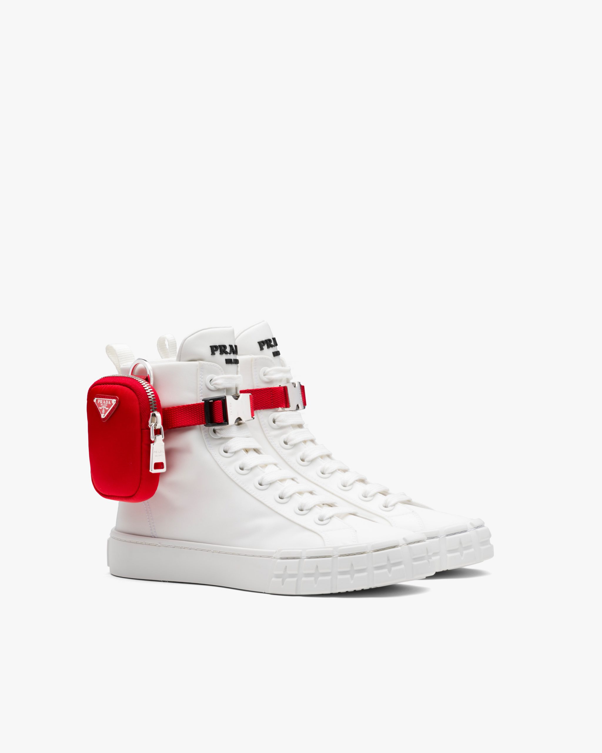 These Wheel high-top sneakers have a technical allure and are made of Re-Nylon gabardine: the regenerated nylon fabric that has become an emblem of the brand, produced from recycled plastic trash recovered in the ocean. The footwear is decorated with a removable nylon pouch with zipper and emblematic triangle logo2 on the front.