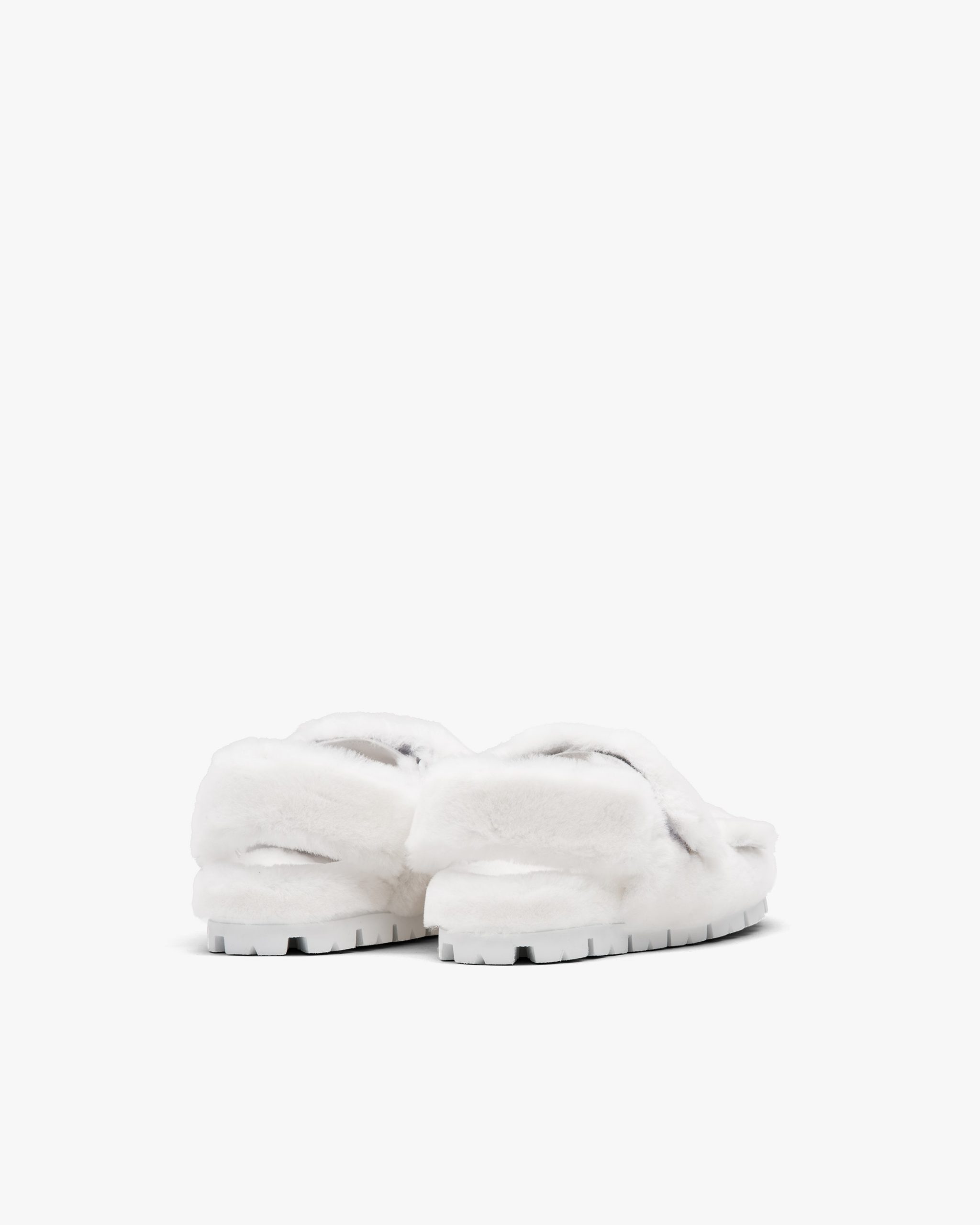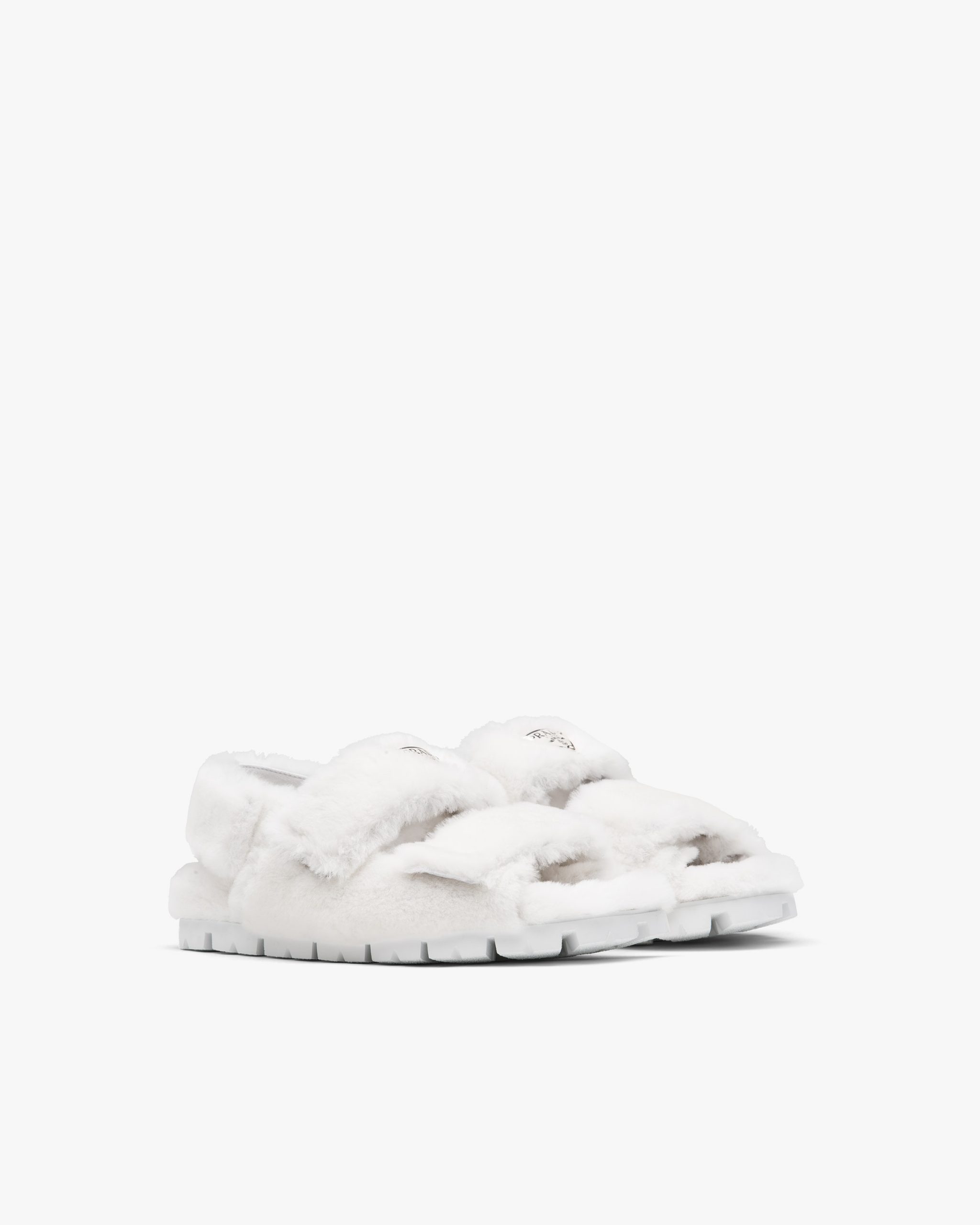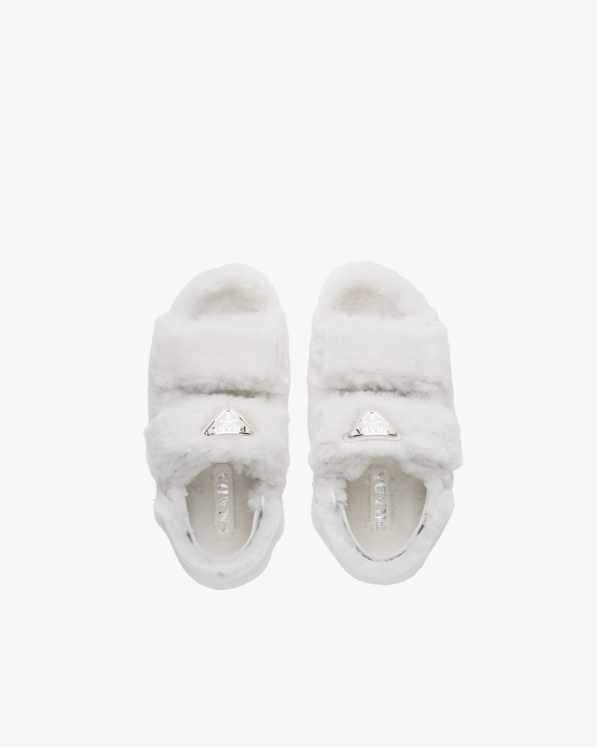 Freedom of movement and comfort come together in the contemporary design of these shearling sandals with strap closure that recalls the sports world. The enamel triangle logo2 embellishes the silhouette.