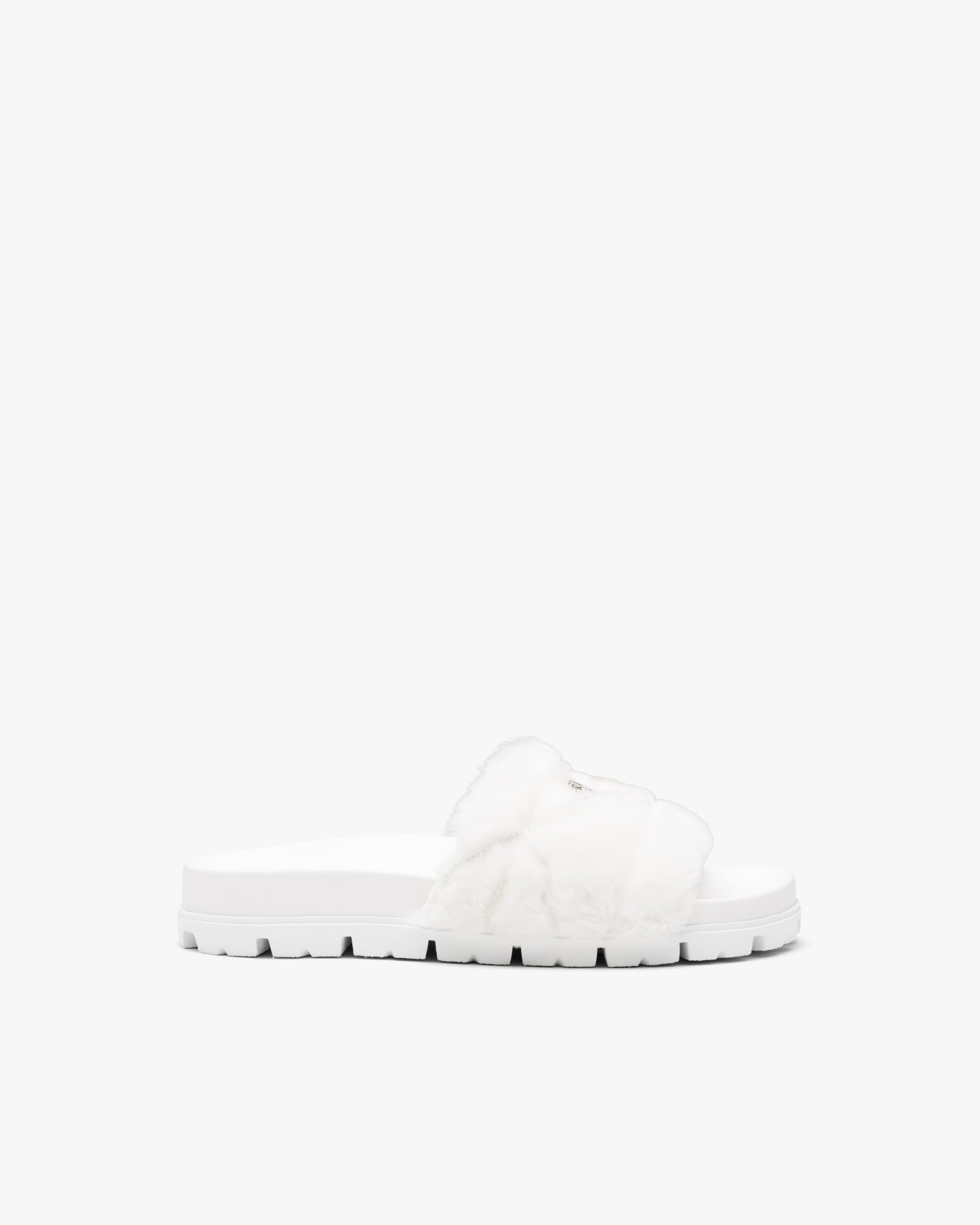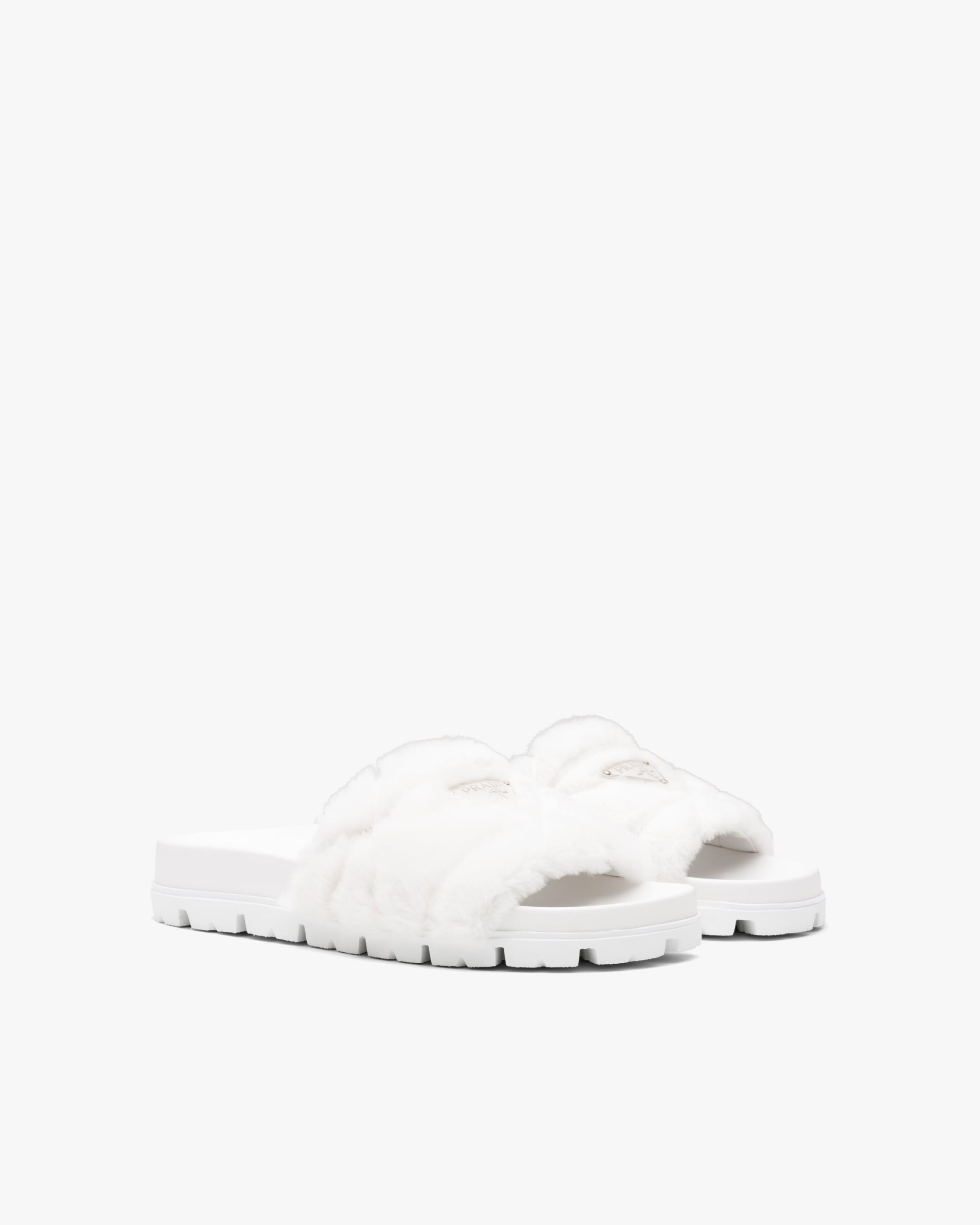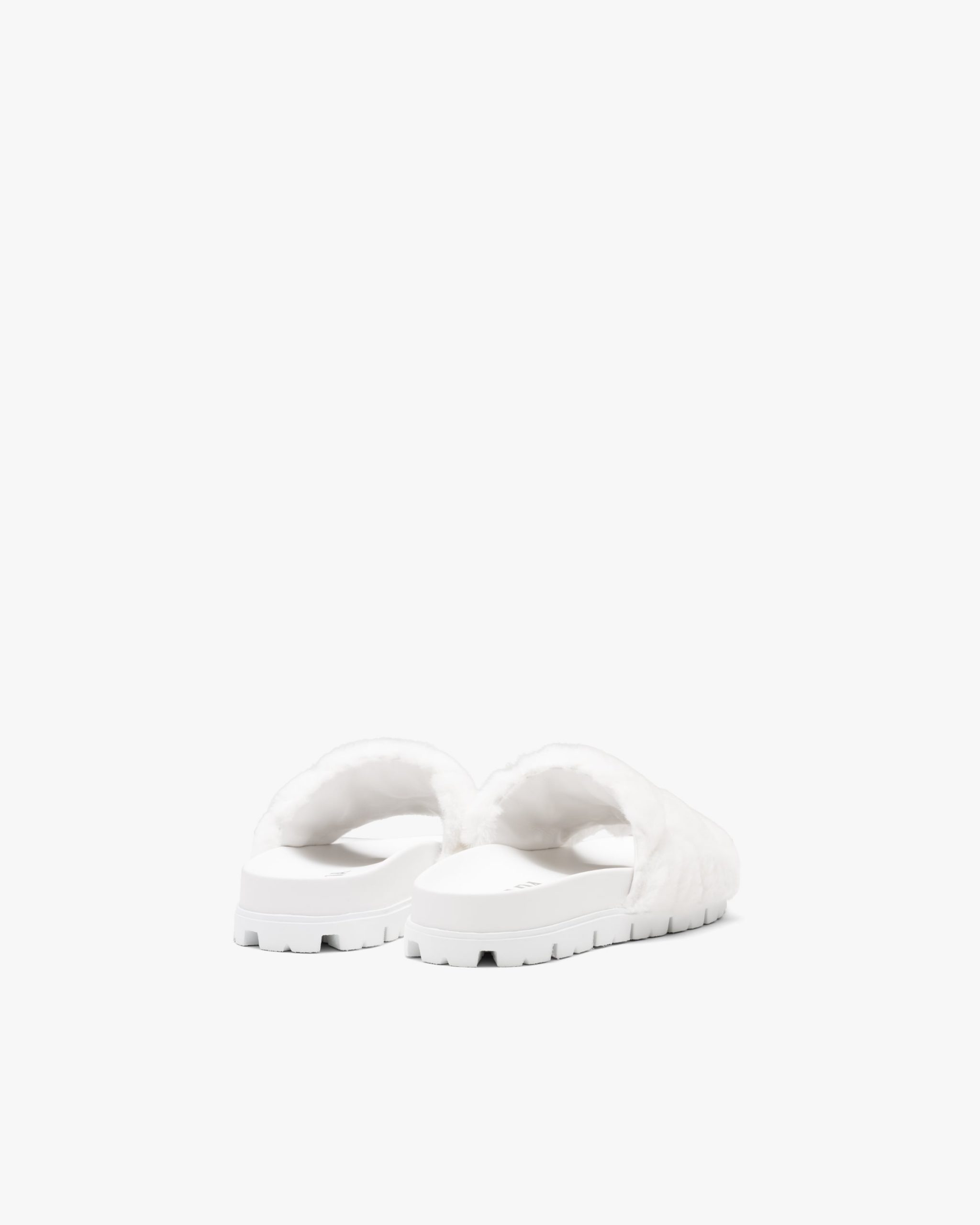 The iconic Prada triangle is echoed in the quilted motif of these shearling slides on a rubber sole and accented by the enameled metal triangle logo2.