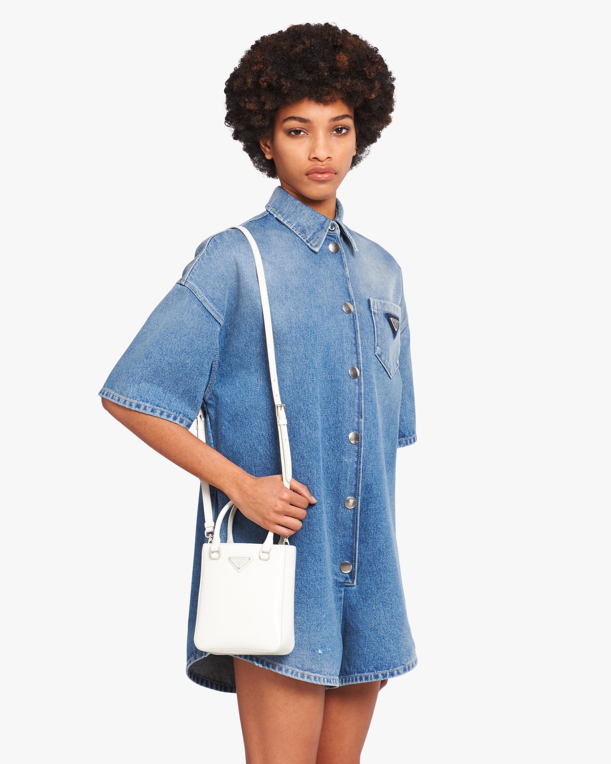 This small tote with a sleek, square design is made of brushed leather, an iconic material of the brand since the nineties and traditionally tied to the luxury world. The design, completed by the detachable leather shoulder strap, can be worn in several ways.