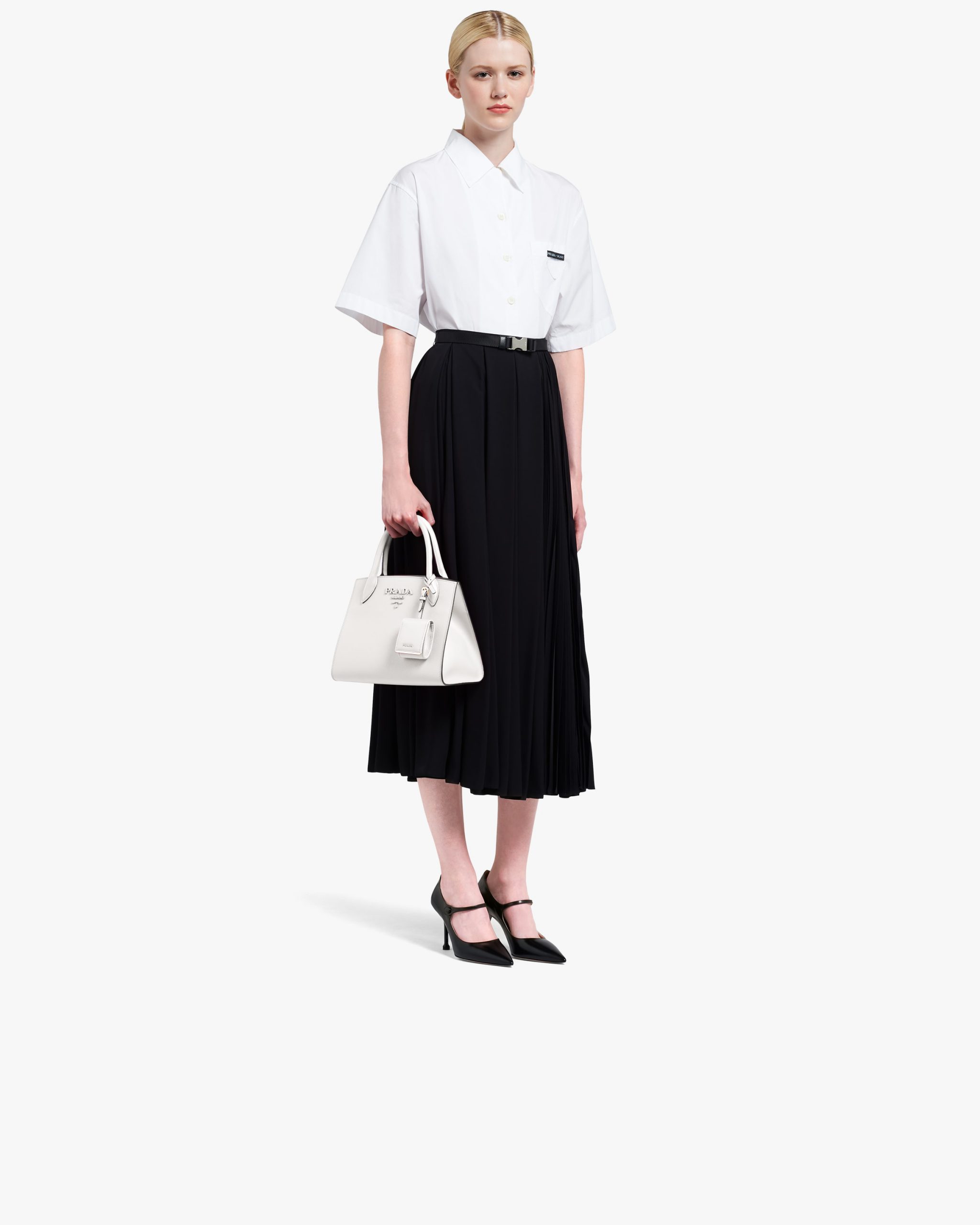 The refined front of the bag is completely monochrome. Made of fine Saffiano leather, it is characterized by the distinctive tone-on-tone effect of the metal lettering logo2.