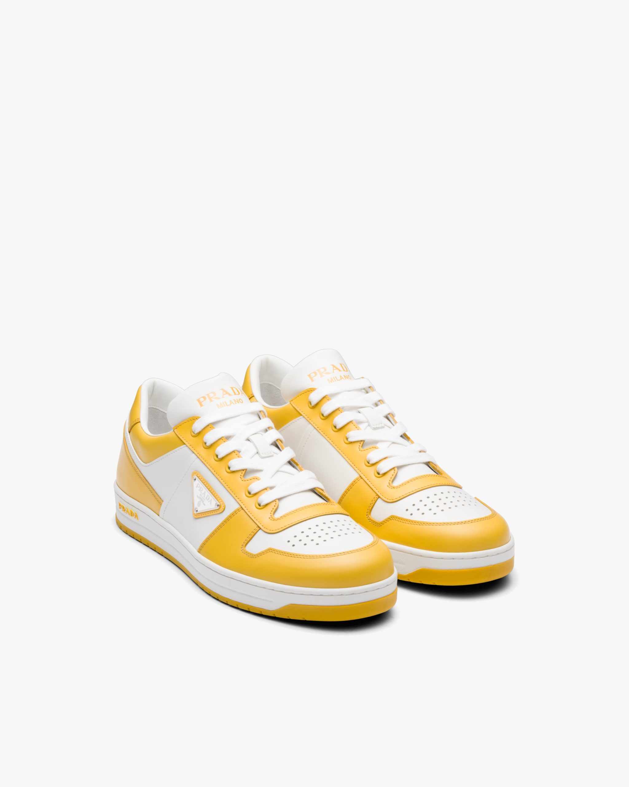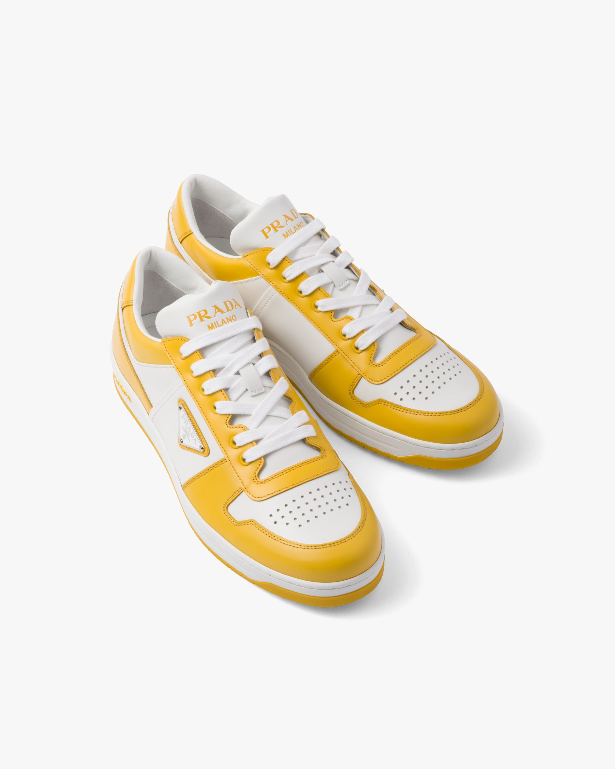 These sporty leather sneakers are accented with different interpretations of the Prada logo2 that appears on the tongue, along the light rubber sole, and as the iconic enameled metal triangle decorating the side of the upper.