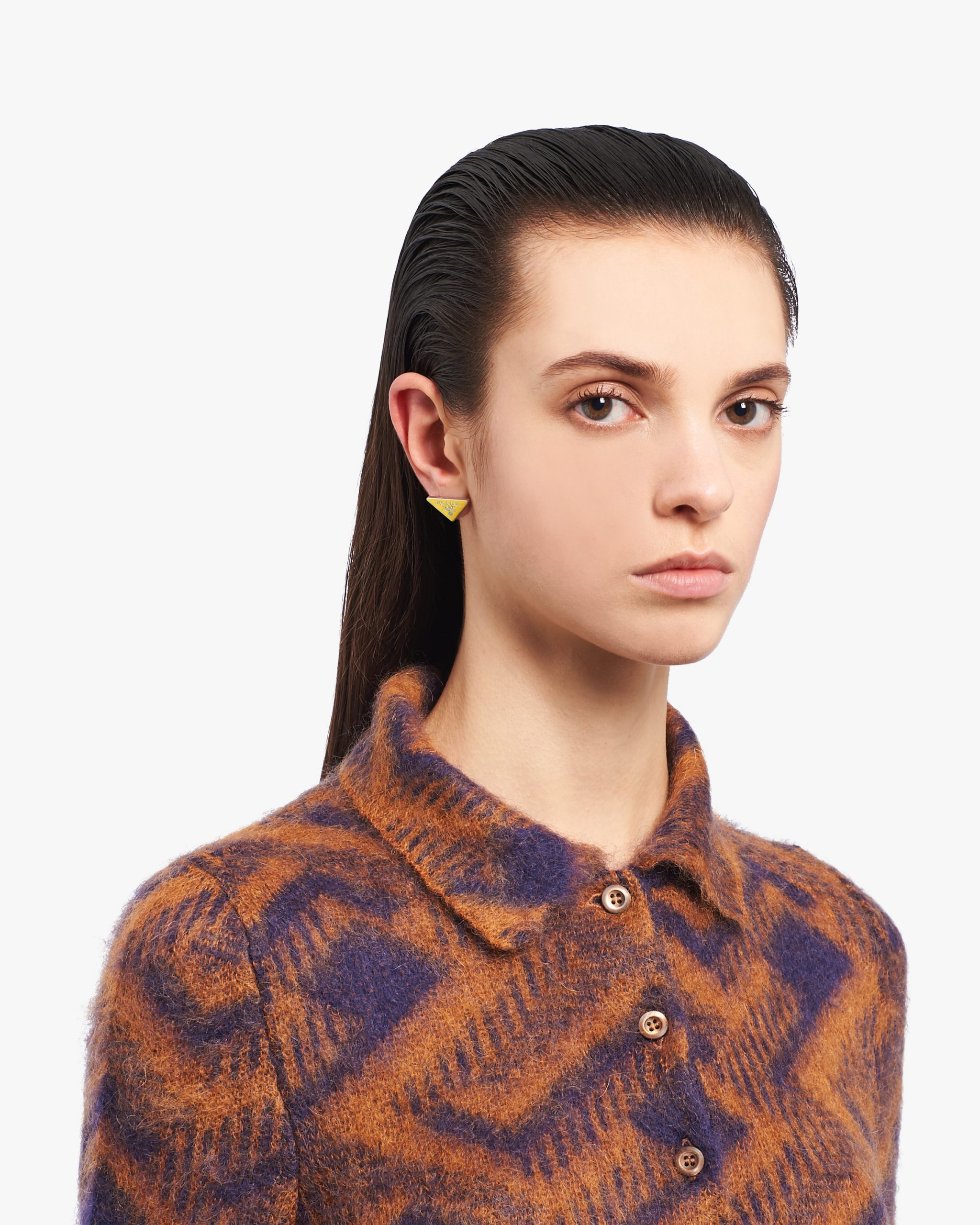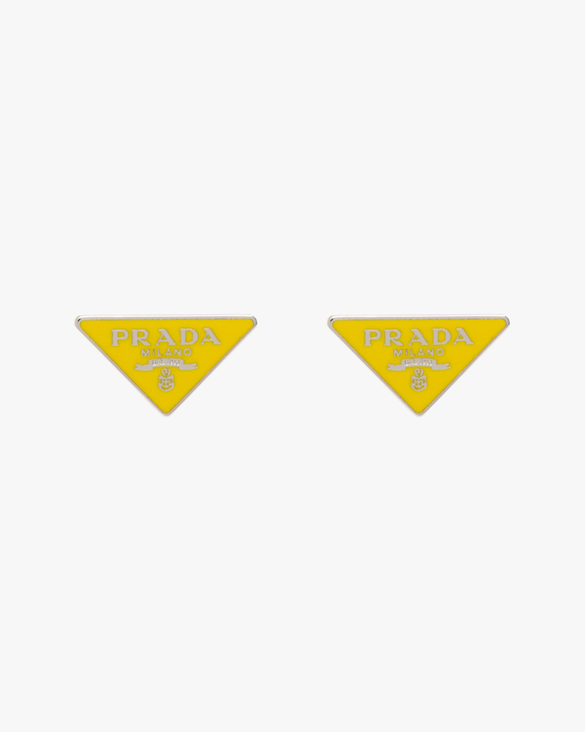 Prada’s historic symbol decorated with enamel defines this pair of earrings. Iconic and sleek, the triangle logo2 is the protagonist of a new line of jewelry made of 925 sterling silver that reinterprets punk influences in a modern way.