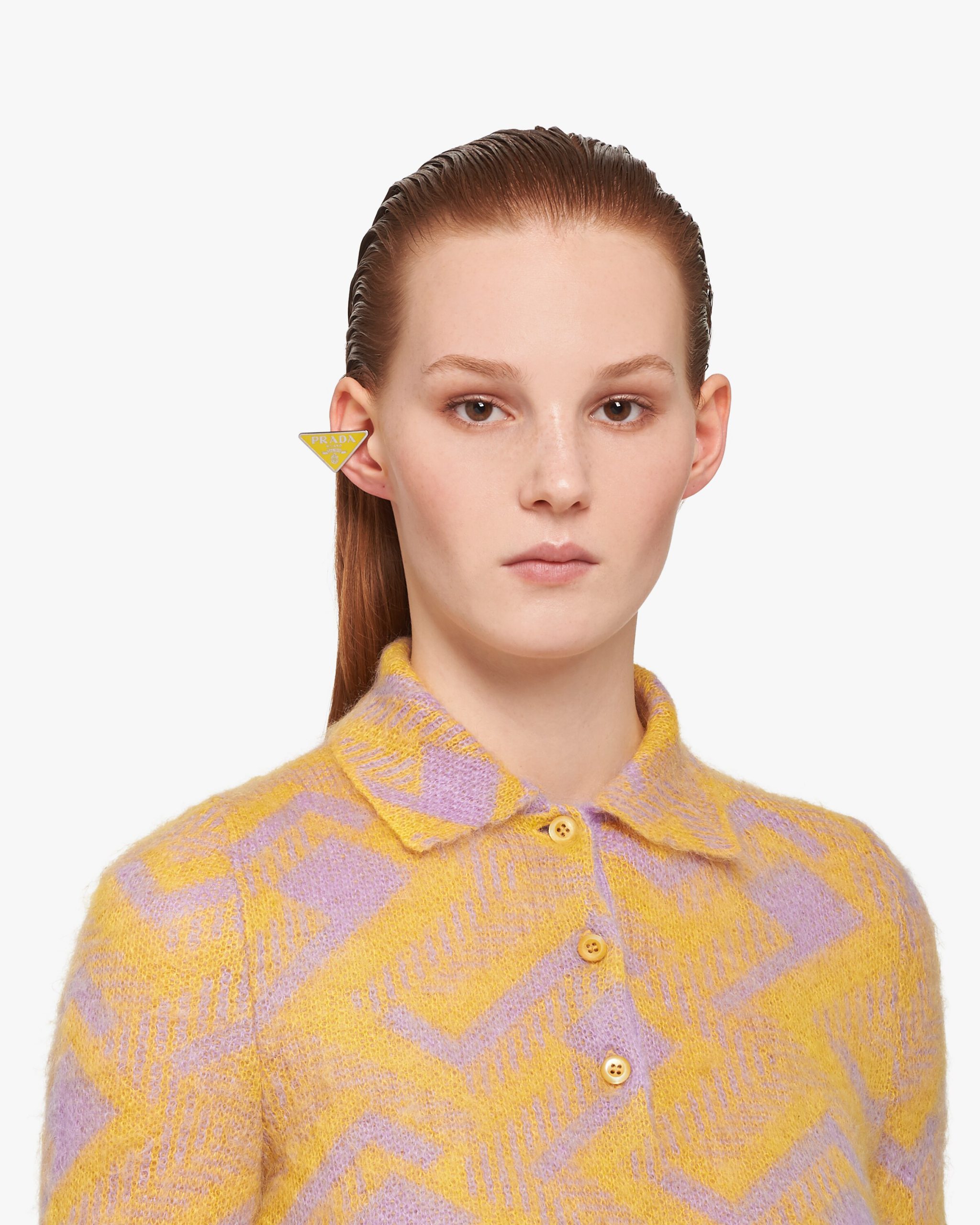 Prada’s historic symbol decorated with enamel defines this single earring worn on the right. Iconic and sleek, the triangle logo2 is the protagonist of a new line of jewelry made of 925 sterling silver that reinterprets punk influences in a modern way.