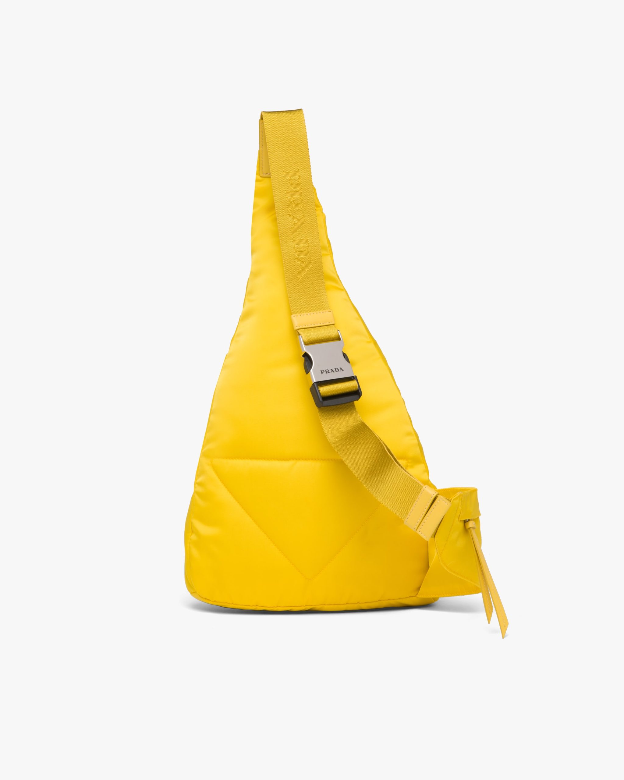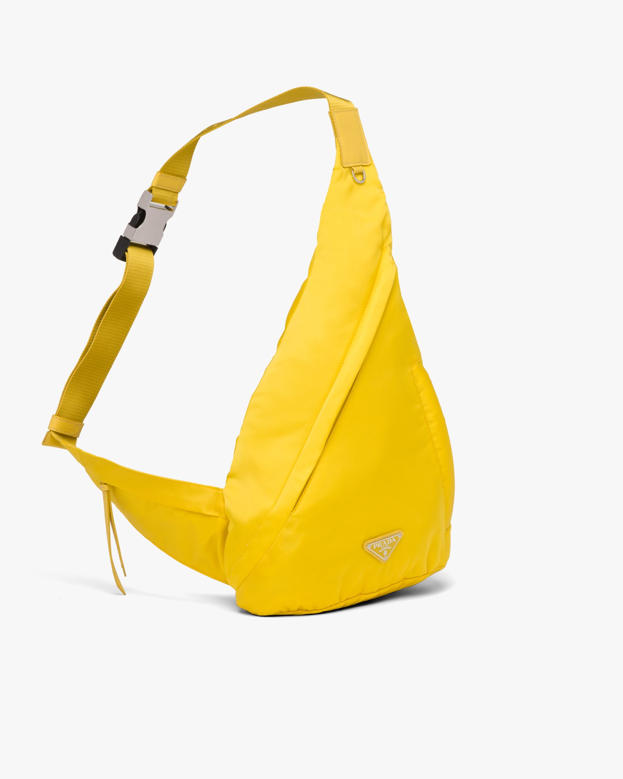 Sleek, minimalist lines are the choice for the new men’s bags for Fall Winter 2021. Defined by its hybrid design, halfway between a backpack and shoulder bag, this accessory has one adjustable woven nylon shoulder strap with side-release buckle and is decorated with the iconic enameled metal triangle logo2. The silhouette is made of innovative Re-Nylon, a regenerated yarn produced from recycled plastic trash collectsed in the ocean.