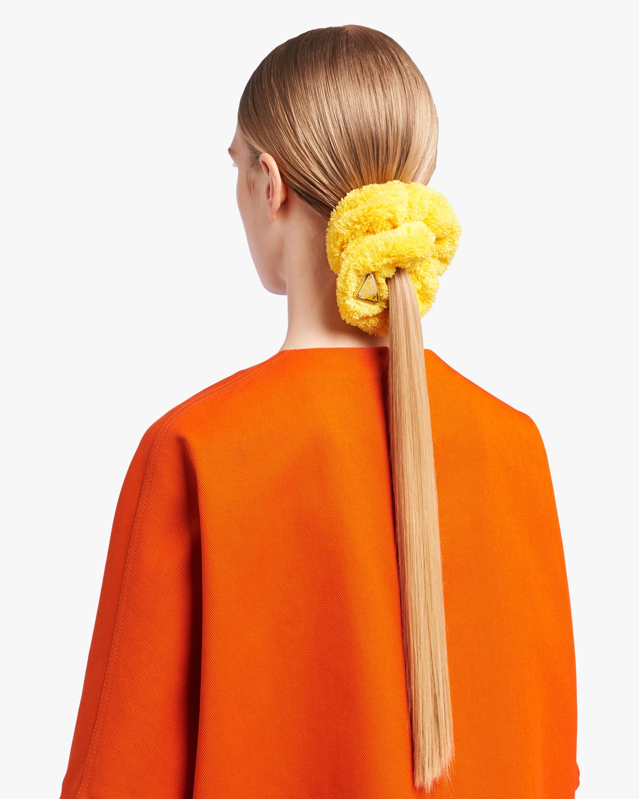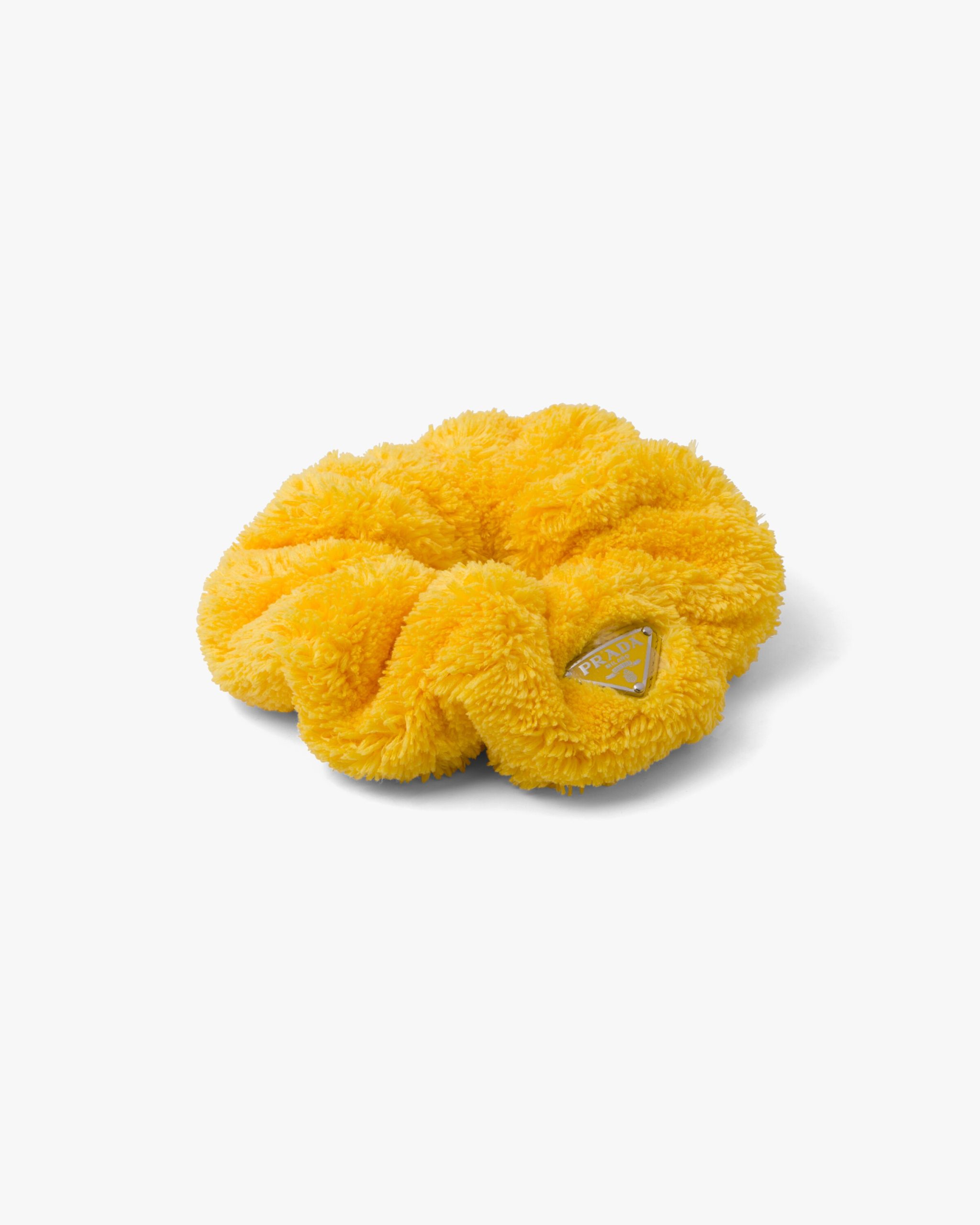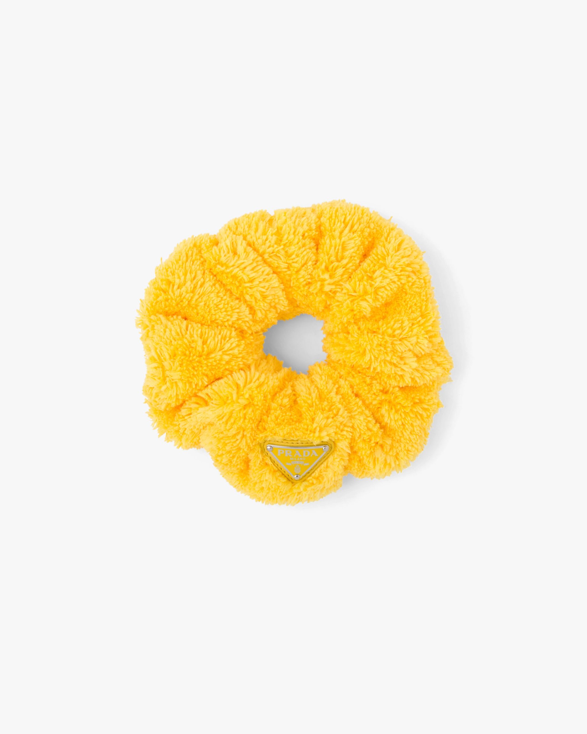 This scrunchie with a retro mood is made of soft terry cloth, a fabric that brings to mind the romantic elegance of summer in the fifties. The enameled triangle logo2, an emblematic element of Prada, decorates the design and adds an iconic accent.